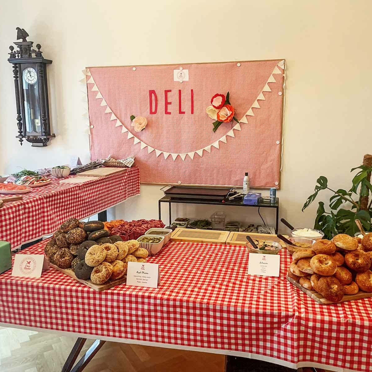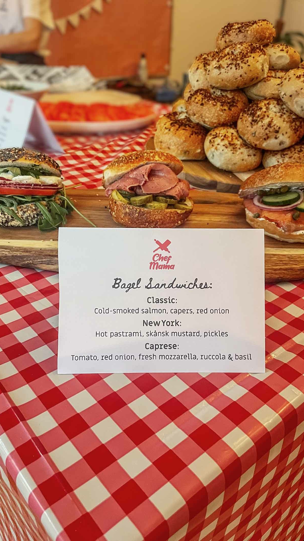 Chef Mama offers catering and event services to both businesses and individuals who are looking to offer a uniquely American food experience to their guests. We can make ready-made sandwiches and sweets for you to pick up, we can set up an American deli station at your event where we’ll make and serve bagel sandwiches to your guests – or why not rent a private room for your next party at our cafe?